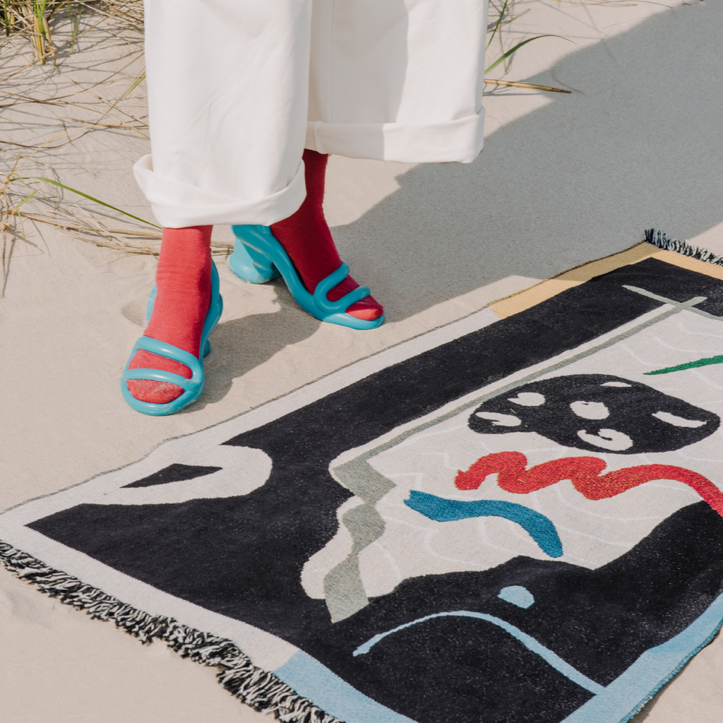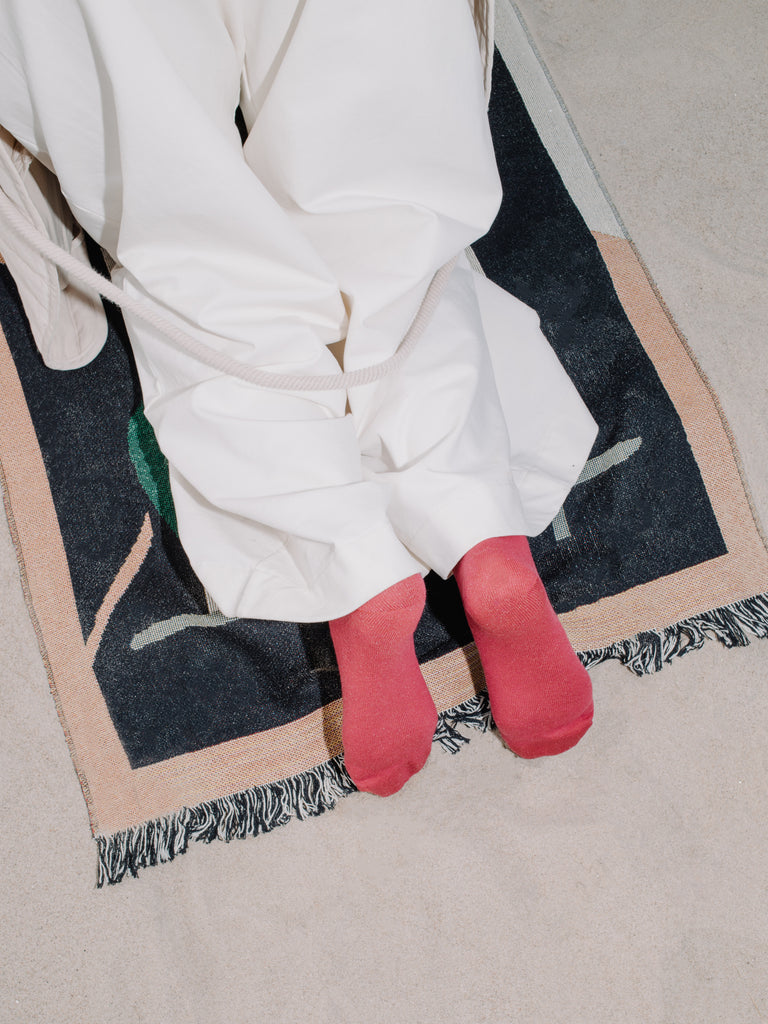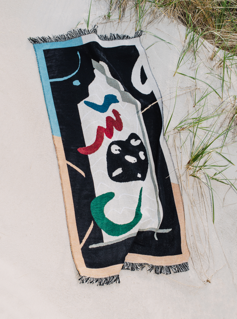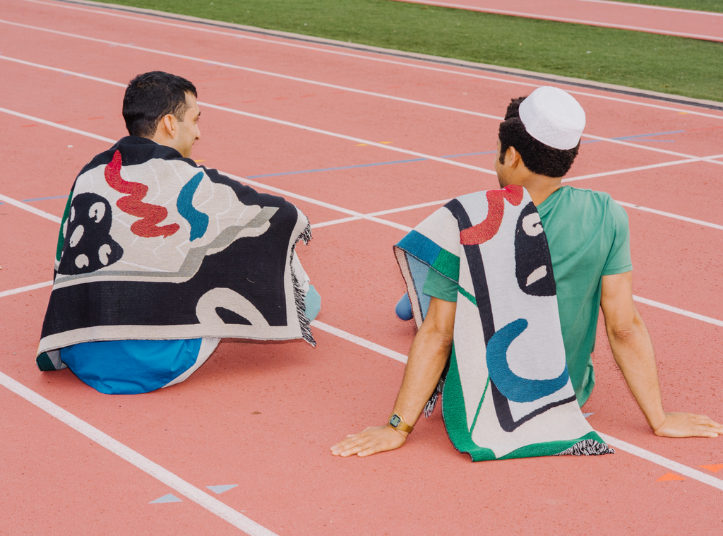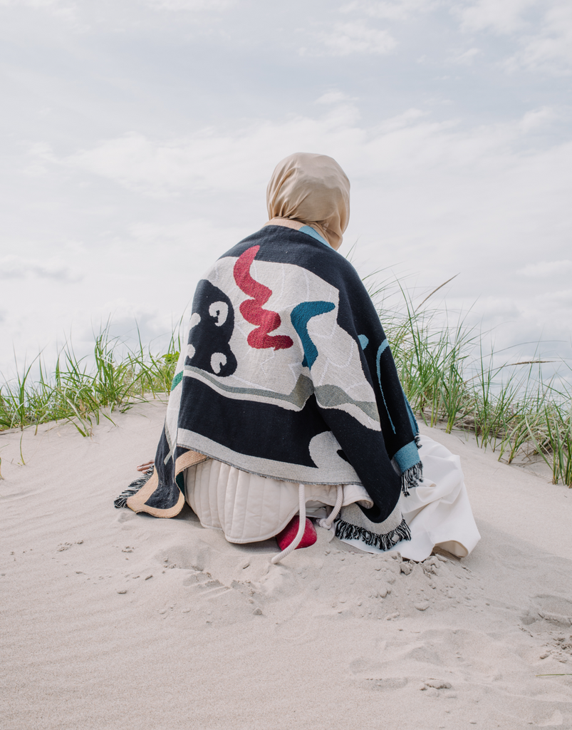 Cotton prayer mat in Multicolored shapes within a solid black bordered arch. The Dhikr mat can also be used as a shawl, throw, or tapestry.